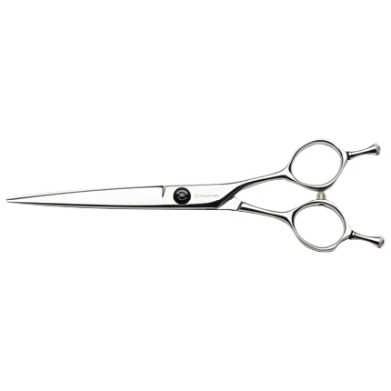 Ciseaux réversible idéal pour droitier et gaucher, positions multiples en main selon l’utilisation souhaitée. Acier, Inox 440C dureté 61 HRC. Lames concaves avec affûtage convexe sans angle, pour couper et slicer. Vis micrométrique avec clé de réglage. Butée uréthane vissée. Repose doigt amovible.