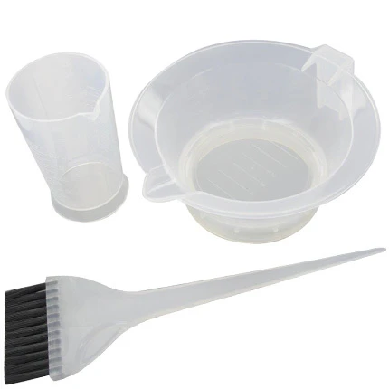 Kit coloration composé d’un bol antidérapant avec bec verseur, d’un pinceau à double rangée de poils et d’un verre doseur.