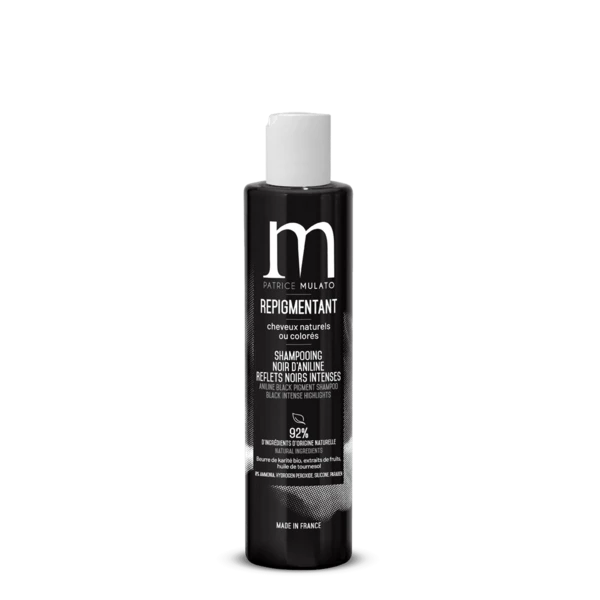 Shampoing repigmentant noir d’aniline, reflets noirs intenses.